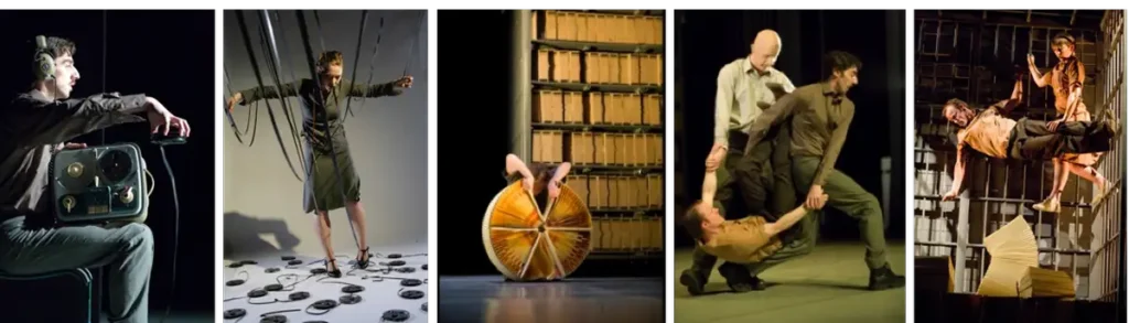 Trapped (Maresa von Stockert / Tilted Productions, 2008/09) ist ein multidisziplinäres Tanztheaterstück, das Überwachung, Kontrolle und psychologische Spannung erforscht. Von Stockerts Choreografie verwandelt abstrakte Konzepte in präzise, ausdrucksstarke Bewegungen und balanciert eng strukturierte Ensemblemuster mit Momenten chaotischer Befreiung. Jeremy Coxs einfallsreicher Soundtrack verbindet industrielle Klänge und gefundene Objekte und interagiert nahtlos mit der Bewegung, um Atmosphäre und narrative Wirkung zu verstärken. Das Bühnenbild erzeugt eine beengte, labyrinthartige Umgebung, die die Bewegungen der Darsteller aktiv lenkt und die immersive, spannungsgeladene Welt des Werks unterstreicht.